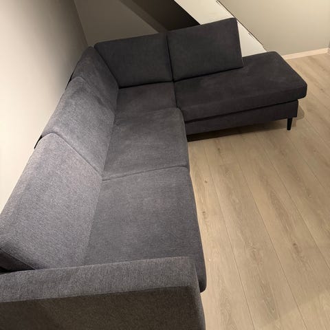 Fint brukt. Lysegrått melert stoff. Kjøpt på Skeidar for 19000kr i 2015. Løse ryggputer som kan vaskes. To nakkeputer følger med. Leveres nyvasket/nyrenset. Høyre side er lengst.