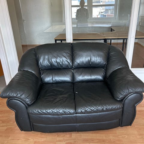 Selger en 2-seter skinnsofa med utskårne detaljer på beina av tre. Skinnet er fortsatt helt og pent, men delene i tre hadde hatt godt av litt stell. Den er god å sitte i. Sittehøyde ca 44 cm.