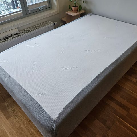 Malt med matt bengalakk. Følger med en eldre rammemadrass og nyere overmadrass. Er demontert. Hentes i Brevik.