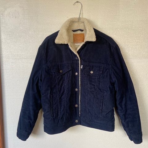 Levi's jakke for dame i størrelse S. Jakken er laget i bomull og har en kort, rett passform. Den har krage med mykt teddyfôr og fôret innside i overkroppen, samt knappelukking foran. To brystlommer med klaff og knapp, samt sidelommer. Fargen er oppgitt som blå i annonsen, men fremstår lys/ offwhite på bildene. Passer som hverdagsjakke i overgangssesonger.