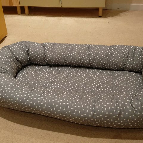 Veldig pent brukt babynest i beige farge. Myke, polstrede kanter rundt hele liggeflaten gir en omsluttende plass for baby. Passer til bruk i seng, sofa eller på gulv som en avgrenset liggeplass.