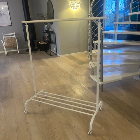 Frittstående klesstativ i hvit tre og metall stang. Svensk design, veier lite og er svært lett å slå sammen. Innvendig mål på metall-stangen er 60 cm. Med en høyde på hele 150 cm kan også lengere klær henges på denne. Ta gjerne med noen flere kleshengere dersom behov.