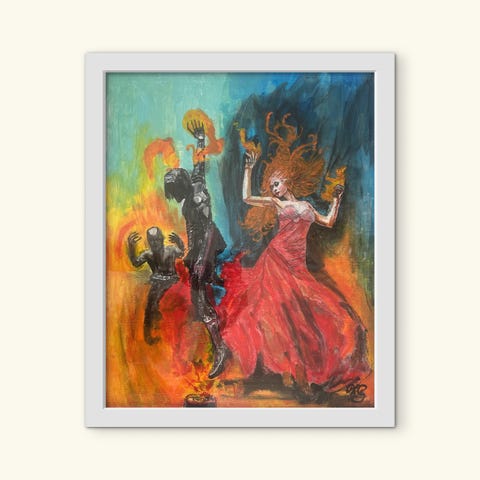 Maleri som viser et dansende par. Motivet er en kvinne i rød kjole og en mann i mørk dress i en tett dansestilling. Fargene domineres av rødt, svart og hvitt, med dynamiske penselstrøk som gir bevegelse i komposisjonen. Bildet kan passe godt som veggdekor i stue, gang eller andre oppholdsrom der man ønsker et figurativt og uttrykksfullt motiv.