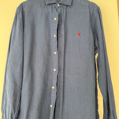 Ralph Lauren Polo skjorte for herre i størrelse M. Skjorten er blå og laget i lin. Den har klassisk krage med knapper, knappestolpe foran og lange ermer med mansjetter. Brystet har brodert logo. Passer til både hverdagsbruk og mer formelle anledninger, og kan brukes alene eller under genser eller jakke.