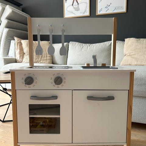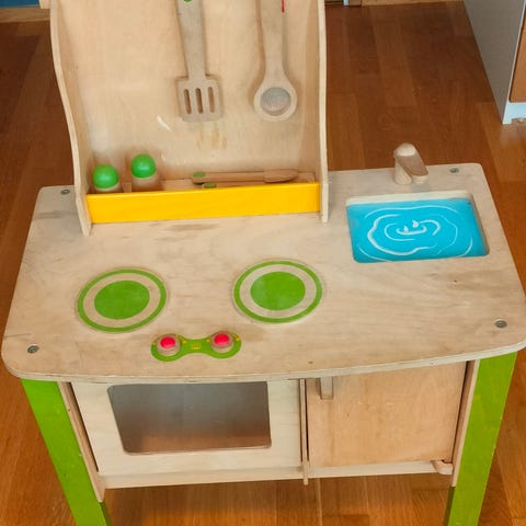 Stilrent lekekjøkken i tre fra Teamson selges med mye tilbehør kjøpt nytt på jollyroom. Passer fint inn på barnerommet.