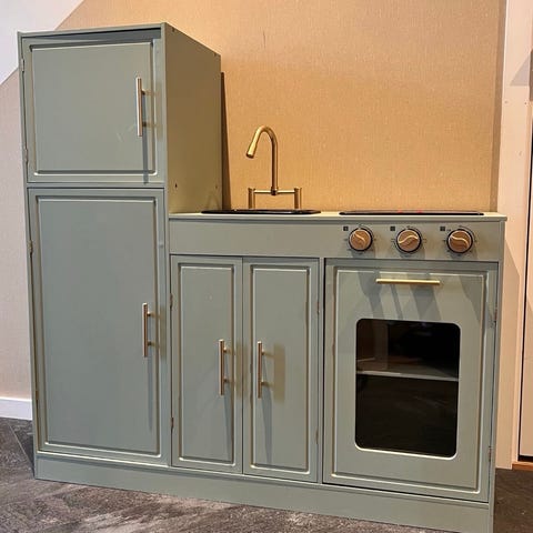 Kjøkkenet har vask, koketopp, stekeovn og skap med god oppbevaring. Solid lekekjøkken i tre og messingfargede detaljer.