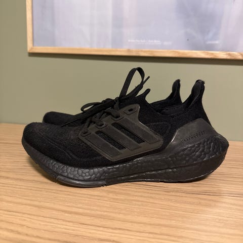 Adidas Ultraboost løpesko i størrelse 40. Skoene er i svart. De sitter veldig bra på foten. Yttersåle med gummimønster for godt grep. Egnet til løping og annen trening. Eller på jobb for eksempel.