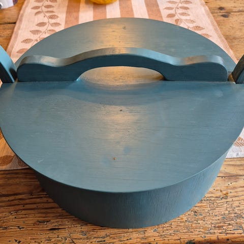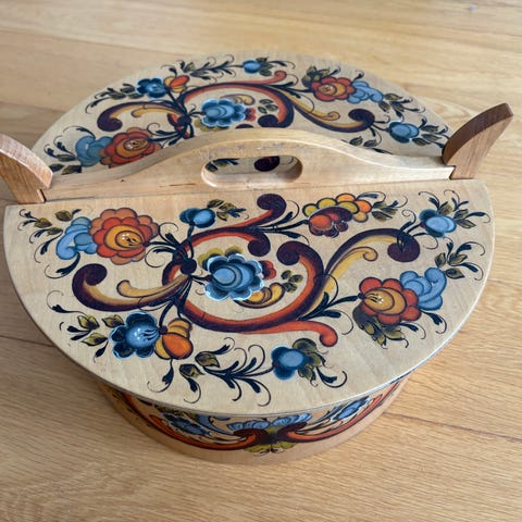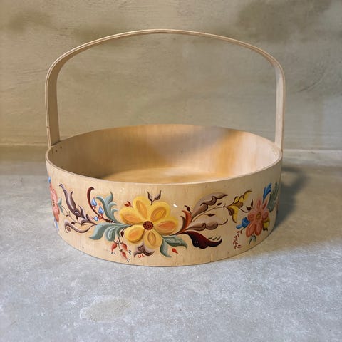 Rund rosemalt tine i tre, med lokk og bærehåndtak. Settet består av to tiner i ulik størrelse, begge dekorert med tradisjonell rosemaling i flere farger. Tinenes form og utforming gjør dem egnet til oppbevaring eller som dekorative gjenstander i interiøret. Materiale: treverk med malt overflate. De har navn inni lokket.