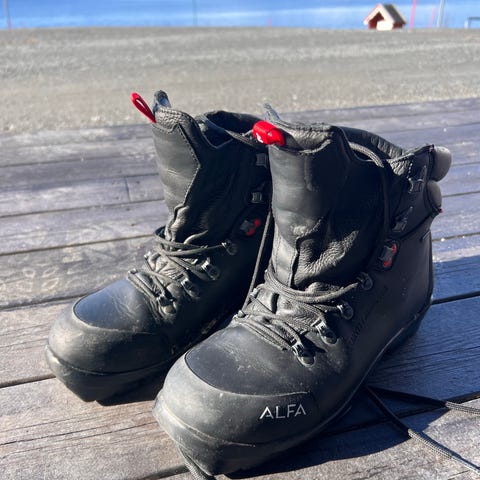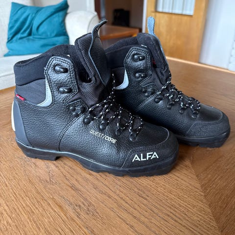 Alfa skisko i størrelse 45. Modellen er en høy, snørestøvel beregnet for bruk med ski. Skoene er svarte og har Gore-Tex-membran, som gir vannavvisende og pustende egenskaper. Egnet til tur og annen bruk der det er behov for stabile og varme skisko i størrelse 45. Skoen er tilpasset BC binding