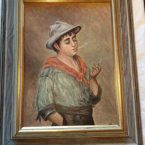 Maleriet er trolig fra midten av 1900-tallet (ca. 1950–1970) og passer fint som dekor i klassisk eller retro interiør. Den ornamenterte rammen gjør bildet ekstra dekorativt.