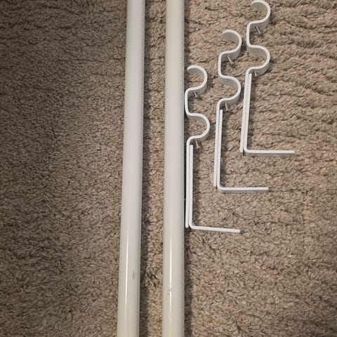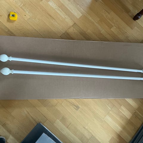 2 stk. gardinstenger. Måler 120 cm pr. del. Kan trekkes ut til 215 cm. Kr 230,- pr. gardinstang med endestykker.