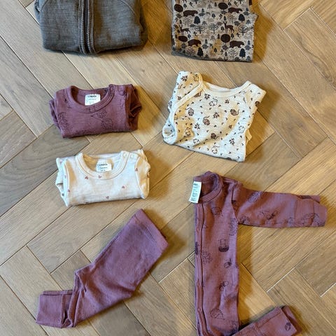 Selger en liten klespakke med klær i bomull i størrelse 44. Brukt av mine tvillingjenter, men passer kanskje best til en liten gutt :)