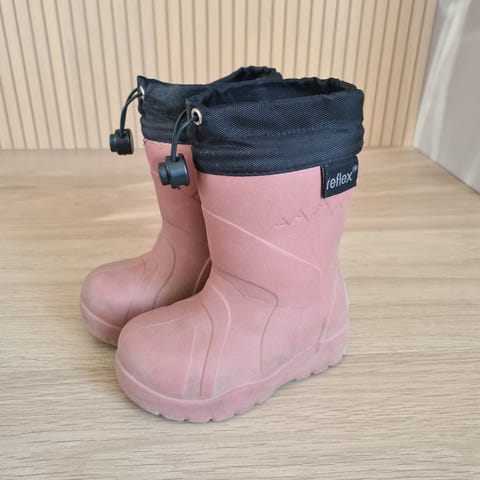 Reflex barnestøvler for barn, unisex. Støvlene er i svart farge med grov såle for godt grep. Overdelen kombinerer gummiert materiale nederst med tekstil øverst for bedre passform rundt leggen. Passer til bruk i vått og kjølig vær. Størrelse 23.