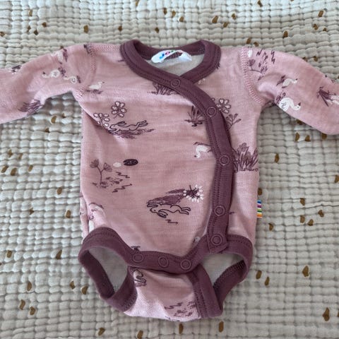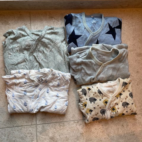 Selger en liten klespakke med bodyer i merinoull, viskose/bambus og bomull i størrelse 40/44 og 44. Fra merker som Joha, Newbie, Polarn O. Pyret og Kongens Sløyd.