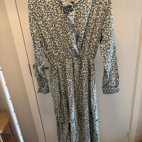 Helt ny og ubrukt Happy Holly Serene sommerkjole for dame i størrelse 40. Kjolen er i "dusty green" farge med mønstret trykk og er laget av polyester. Modellen har lange puff-ermer, knappestolpe foran og avtagbart knytebelte i livet. Rett, knelang passform egnet til bruk vår og sommer.