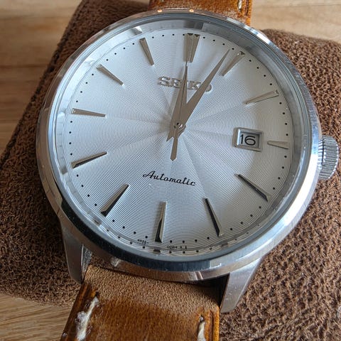 Certina DS-1 Powermatic 80 herreklokke med automatisk urverk. Klokken har sølvfarget urskive med datovisning klokken tre og enkle indeksmarkeringer. Kassen er i metall med polert finish, og baksiden har gjennomsiktig baklokk som viser urverket. Modellen leveres på brun lærrem med foldespenne.