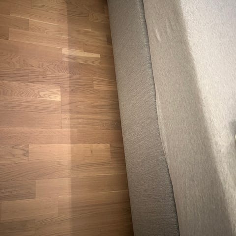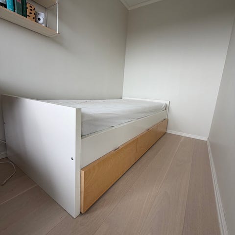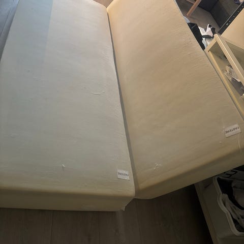 Det kommer fra et hjem med katter, så noe kloremerker er det på dem. Rammemadrass følger IKKE med. Må hentes og bæres ned selv, fra 4. Etasje. Beina er lakkert i sort.