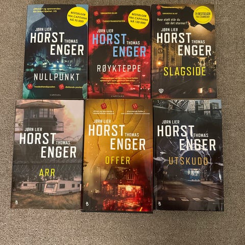 Bokpakke med fire krimbøker av Jørn Lier Horst og Thomas Enger. Titlene i pakken er «Offer», «Røykteppe», «Arr» og «Slagside».