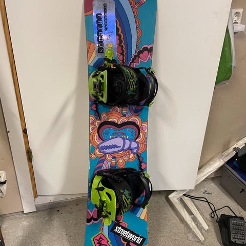 Man kan sette på bindinger og bruke det som et nybegynner snowboard. Det går saktere enn vanlig brett så fint for de minste.