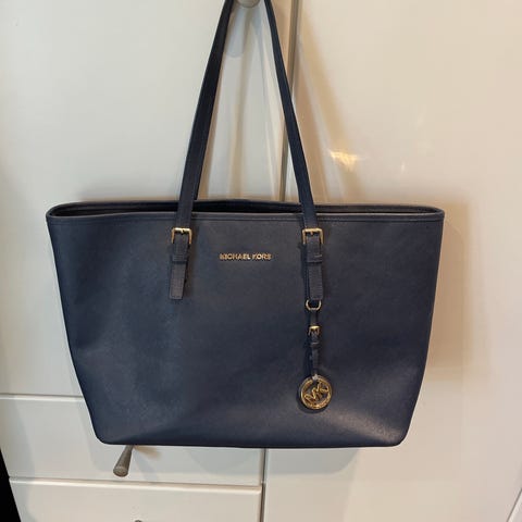 Michael Kors skinnveske for dame i gul farge. Vesken er laget i lær og har både hanker og avtakbar, justerbar skulderrem. Den lukkes med metallbeslag og har dekorative metall-detaljer med MK-logo. Innvendig er det flere rom og lommer som gir mulighet for organisering av innhold. Undersiden har metallføtter som beskytter vesken når den settes ned.