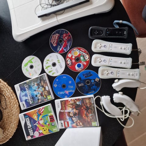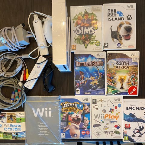 Nintendo Wii spillkonsoll med tilbehør. Pakken inneholder Wii-konsoll, strømadapter, AV-kabel og sensorbar. I tillegg følger det med flere kontrollere og tilbehør, blant annet ratt, pistolgrep og annen ekstra kontroller. Det følger også med flere Wii-spill, deriblant action- og eventyrspill.