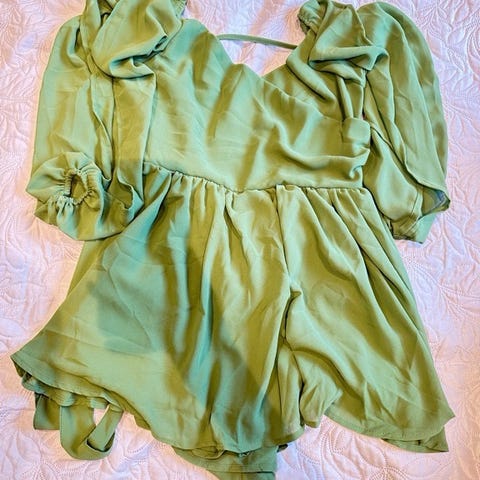 AMISU topp for dame i størrelse L. Toppen er grønn og laget av polyester. Den har dyp v-utringning, lange ermer med strikk og volangkant, samt smocket midje med rysjer nederst. Passer som enkel overdel til hverdagsbruk eller mer pyntede anledninger.