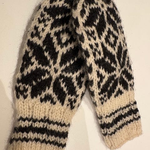 Strikket i Viking sportsragg. Leggings 30 cm lange. Selges med lue 350,-