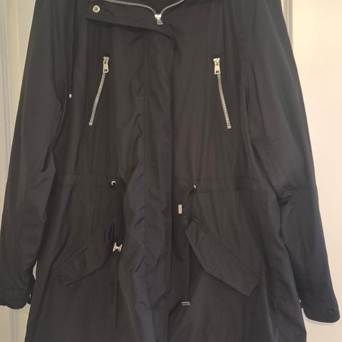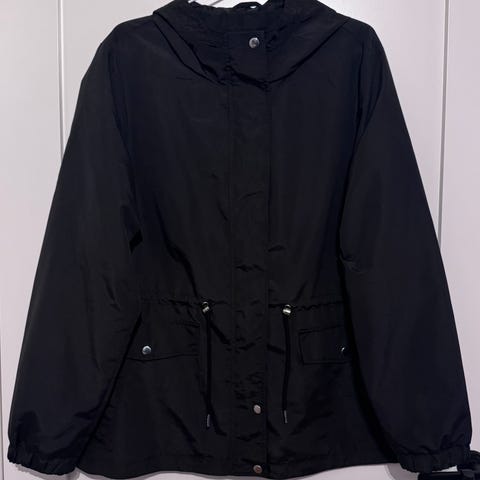 Snøring i hette, midje og nederst på jakken. Glidelås og trykk knapper. Hette kan tas av. Uforet.