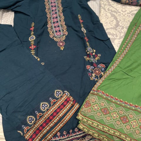 kjole for dame i størrelse M. Kjolen er grønn og laget av polyester. Den har broderte detaljer og mønster langs kantene og nedover plagget. Passer til bruk ved ulike anledninger der man ønsker et mønstret og dekorativt plagg.