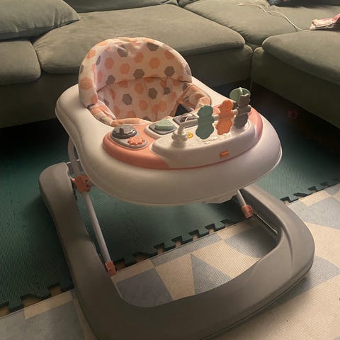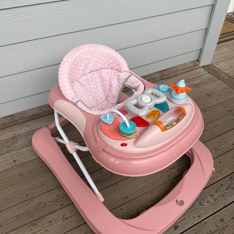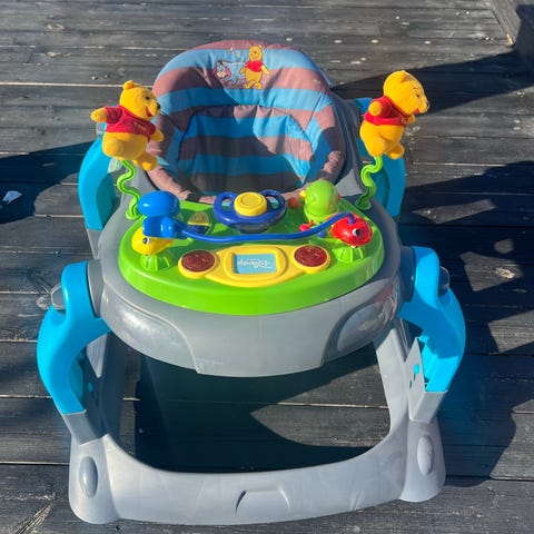 Stolen har hjul, aktivitetsbrett med leker og justerbar høyde. Den er i veldig god stand, nesten som ny. Jollyroom Beemoo Play Explore gåstol i grønn farge. Gåstolen har polstret sete med prikkete trekk og høy ryggstøtte for ekstra støtte til barnet. Understellet har fire hjul og kryssramme i metall for stabilitet. Foran er det et aktivitetsbrett med ulike leker, ratt og knapper i flere farger. Aktivitetsbrettet kan tas av slik at gåstolen også kan brukes med glatt brett med kopp-/flaskeholder. Egnet for små barn som skal øve på å sitte og bevege seg rundt innendørs.