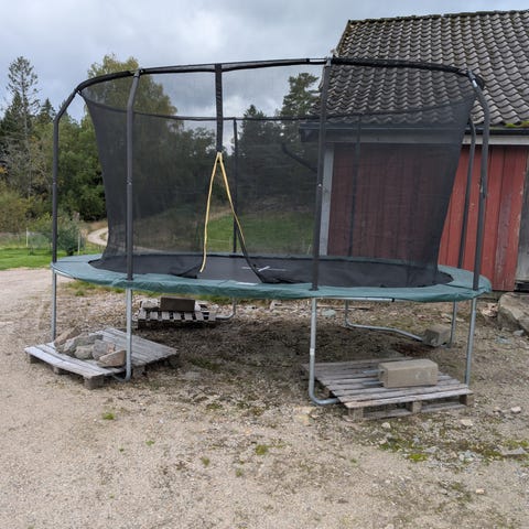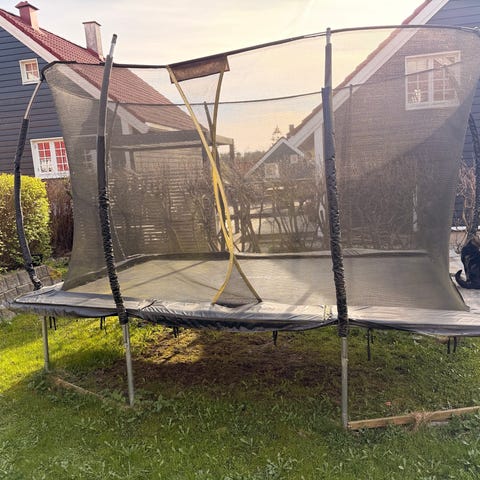 Kjøpt brukt i 2021. Vært demontert og lagret i uisolert bod fra september til mai hvert år. Selges da barna ikke er "triksy" nok til å ha behov for en så stor trampoline.