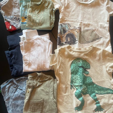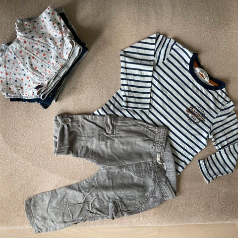 Den ene t-skjorta har mistet litt farge ved halsen, genseren har litt maling på ermet. Ellers ikke noe annet som jeg kan se. Fine klær for barnehage for eksempel.