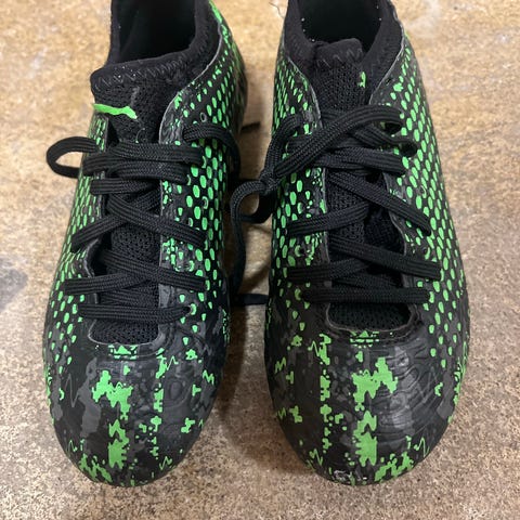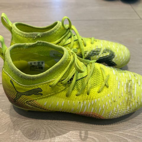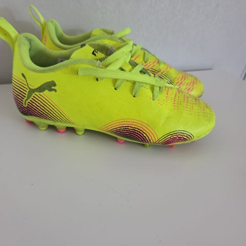 Puma fotballsko for barn i gul farge med mønster i svart og rødt. Skoene har syntetisk overdel med strukturert overflate og snøring foran. Undersålen har mange små knotter som egner seg for spill på kunstgress eller grus. Passer til fotballtrening og lek utendørs. Størrelse fremgår av merkelappen på innsiden av skoen.