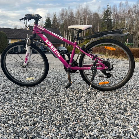 Biltema barnesykkel med 24" hjul i rosa farge. Sykkelen har lav innsteg-ramme som gjør det enkelt å komme av og på. Utstyrt med bagasjebrett bak, skjermer og kjedekasse. Sete og styre kan justeres i høyden for å tilpasses barnet. Egnet som hverdagssykkel for barn som passer 24" hjulstørrelse.