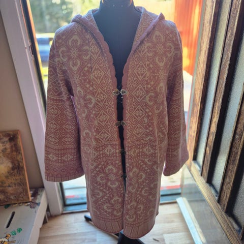 Søkeord: klassisk, alltid pyntet, cardigan, god kvalitet, julebord, fest, uteplagg, grovstrikket, klafflommer i front og krage.