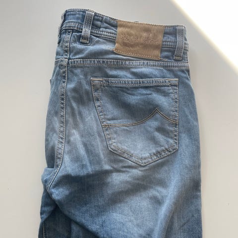 Litt slitt på venstre og høyre baklomme, men ikke vesentlig. Bukse er generelt i bra stand.