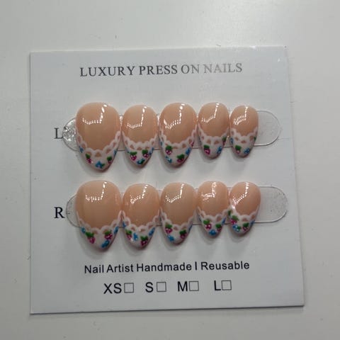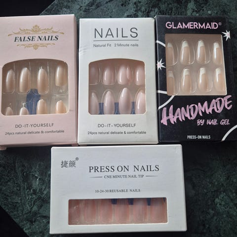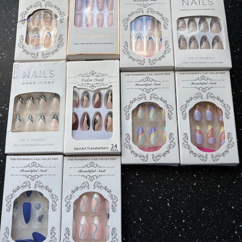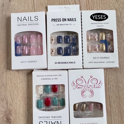 8 sett med flere esker med kunstige negler i ulike design og farger. Inneholder blant annet naturlige nude-toner, fransk manikyr, rosa ombre og mønstre med hjerter og blomster. Neglene er ferdig formet og farget, og passer til bruk ved midlertidig manikyr. Egnet for voksne brukere som ønsker å sette på og ta av kunstige negler hjemme.