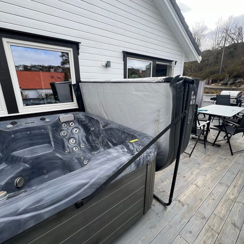Utendørs boblebad med rektangulær form. Boblebadet er nedsenket i en ramme med paneler rundt og har brunt isolasjonslokk. Innvendig kar er mørkt og utstyrt med flere dyser langs sidene og i bunnen, samt formstøpte sitte- og liggesoner. Egnet for plassering utendørs ved bolig eller hytte, og krever tilkobling til strøm og vann samt egnet fundament under karet. Behov for nytt isolasjonslokk.