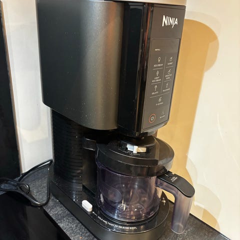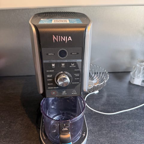 Ninja Creami iskremmaskin selges da den ikke blir brukt. Brukt maks 10 ganger. Følger med 3 beholdere, som man kan se på bildet er det noe bruksmerker på den ene innvendig, fra maskinen.