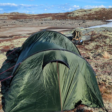 Urberg tunneltelt i blå farge. Teltet har tunnelform med flere stenger som gir god plass i innertelt og fortelt. Egnet til turbruk i fjell og skog, med plass til både soveplasser og oppbevaring av utstyr. Passer til overnatting ved vann, på fjellet eller i andre friluftsområder.