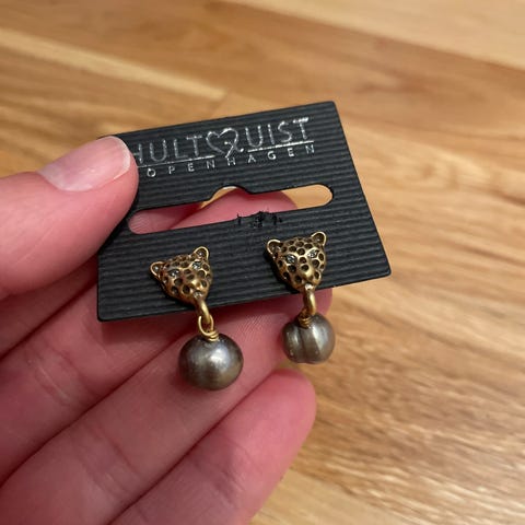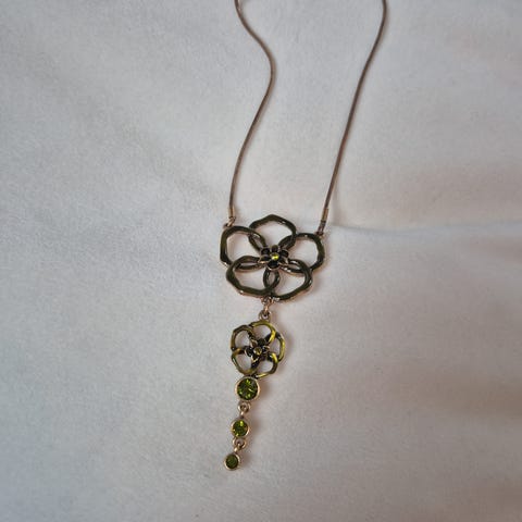 Halskjede med gode symboler for "hell og lykke", en skarabé og firkløver. Litt slitasje, men ikke sjenerende. Ligger pent på brystet. Snart "vintage"!