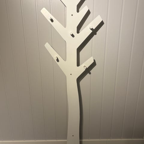 Hvit tre veggmontert klesstativ. Brukt i gangen men fint til barnerom.