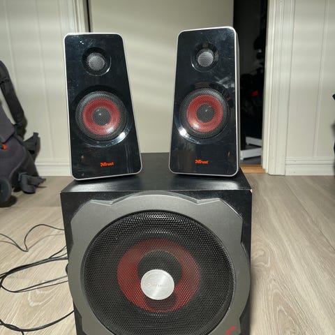 Selger et par kompakte høyttalere som passer perfekt til PC, laptop eller liten arbeidsstasjon. De er små, men gir overraskende grei lyd til vanlig bruk som YouTube, musikk og møter.