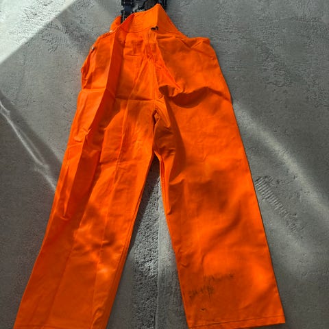 Helly Hansen D-433 regnsett i størrelse medium. Sett med jakke og bukse i rød farge. Jakken har høy krage, knappelukking og frontlommer med klaff. Buksen har rette ben med knapp nederst. Størrelse medium tilsvarer herre 50–52 og dame 44–46 ifølge merkelapp. Materiale er syntetisk regntett stoff. Egnet som regntøy til bruk i vått vær og utendørs arbeid eller fritidsaktiviteter.