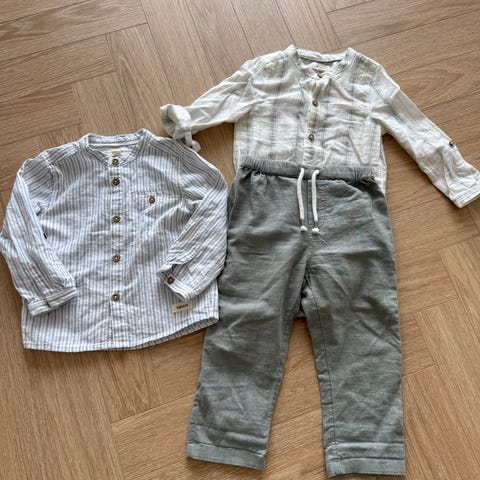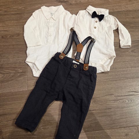 Newbie sett gutteklær i bomull, størrelse 86. Settet består av en hvit langermet body med krage, knappestolpe og svart sløyfe, samt et par svarte bukser med avtagbare bukseseler. Passer til gutt og egner seg til både hverdagsbruk og mer pyntede anledninger.