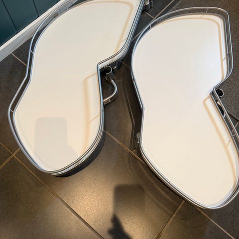 Selges en pen brukt 4-etasjes uttrekkbar Kessebohmer kjøkkenhylle til hjørneskap. For hjørneskap med åpning fra 45 cm, skap lengde fra 90cm og skap dybde 60cm. Høyre svingretning, modell LeMans venstre (se bilde). Farge er lys grå og krom.