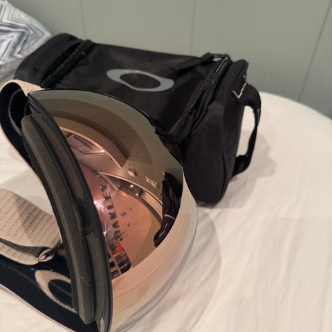 Oakley skibriller med oransje linse og hvit stropp med Oakley-logo. Brillene leveres med etui/veske for oppbevaring og beskyttelse. Oransje linse gir god kontrast og sikt i overskyet og varierende lysforhold. Justerbar stropp gjør at brillene kan tilpasses ulike hjelmer og hodeformer. Passer til alpint og snowboard.
