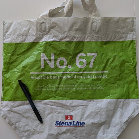 Morsomt tøynett med ordet Orddeling på. Nyvasket, men har bøitt krøllete etter vask. Bør kunne strykes fint igjen.