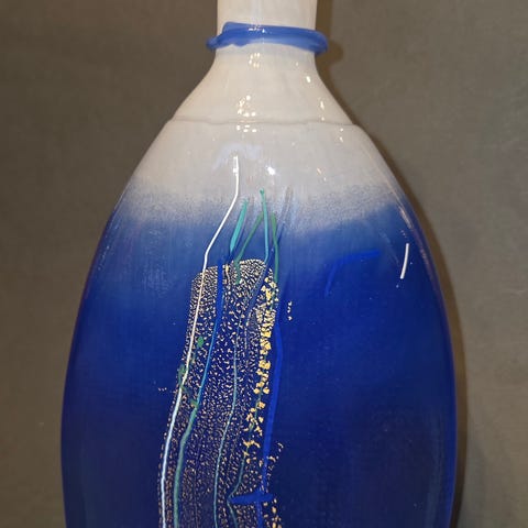 Selger en veldig flott vase i kunstglass. Sannsynligvis er den laget av den anerkjente norske glasskunstneren Benny Motzfeldt, men vi kan ikke finne noen signatur. Vasen har en liten grop i glasset på undersiden (se bilde). Høyde 25 cm.