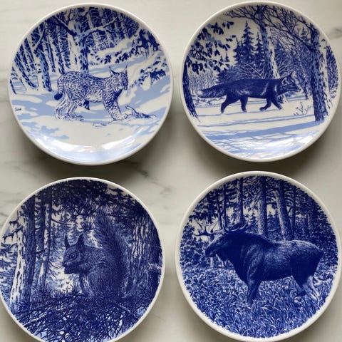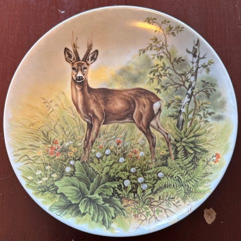 Dekorative tallerkener i porselen med natur- og hjortemotiv. Motivene viser hjort og rådyr i skog- og fjellandskap med detaljerte illustrasjoner av dyr og vegetasjon. Tallerkenene egner seg godt som veggdekor eller som pynt i vitrineskap. Kan brukes som samleobjekter eller som del av en serie med naturmotiverte pyntetallerkener.